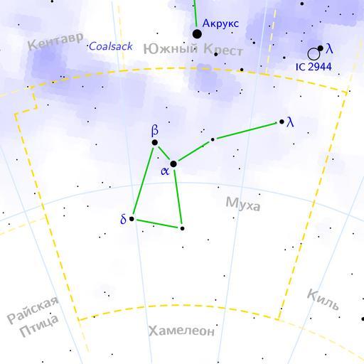 | Keywords: Musca constellation map ru lite.png en Musca constellation map on Russian ru Ка та созвездия ухи на усском языке It was created using the program PP3 At http //pp3 sourceforge net PP3's homepage you also get the input scripts necessary for re-compiling the map The yellow dashed lines are constellation boundaries the red dashed line is the ecliptic and the shades of blue show Milky Way areas of different brightness The map contains all Messier objects except for colliding ones The underlying database contains all stars brighter than 6 5 All coordinates refer to equinox 2000 0 The map is calculated with the equidistant azimuthal projection the zenith being in the center of the image The north pole is to the top The horizontal lines of equal declination are drawn for 0° +10° +20° etc The lines of equal rectascension are drawn for all 24 hours Towards the rim there is a very slight magnification and distortion Own 2006-10-16 Denis Ibaev Constellations_maps_russian |