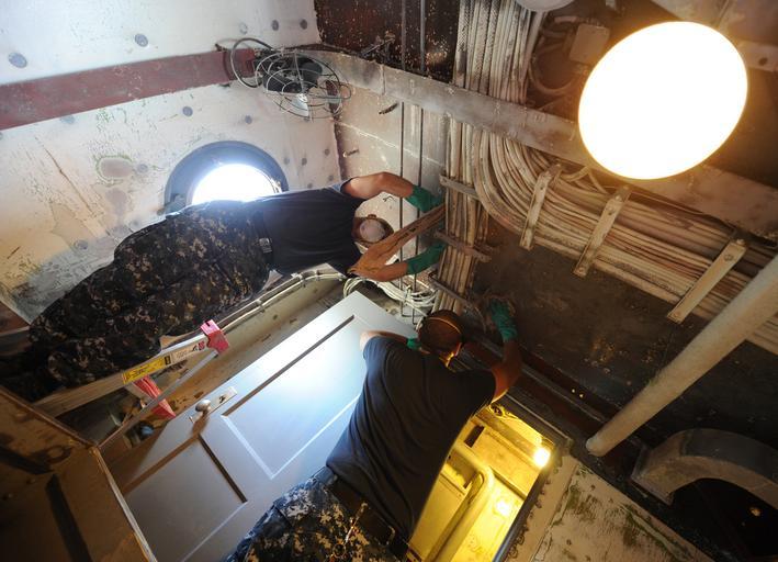 | Keywords: Museum ship 130906-N-PX557-198.jpg en Chief Select Yeoman Raymond Fredrick assigned to Naval Undersea Warfare Center and Chief Select Culinary Specialist Kristopher Freyberg assigned to Naval Station Newport clean the overhead of the captain's sea cabin during a community service project aboard the museum ship USS Massachusetts BB 59 in Fall River Mass Eight chief petty officer selectees performed preservation and restoration work aboard the battleship U S Navy photo by Chief Mass Communication Specialist James E Foehl/Released 2013-09-06 Chief Petty Officer James Foehl https //www dvidshub net/image/1016186 130906-N-PX557-198 2013-09-12 07 08 FALL RIVER MA US PD-USGov-Military-Navy Naval Station Newport Images from DoD uploaded by Fæ |