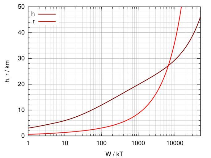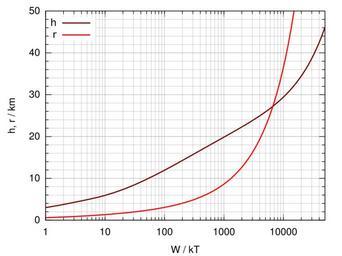 Keywords: Mushroomcloud Size.svg en Final height h and radius r of a nuclear mushroom cloud as a function of the explosive yield W The final height is approximately the height above the burst point for low and intermediate W and approx the height above sea leval for high W Quelle Glasstone Dolan 1977 numerical approximation of original graph de Endhöhe und Radius der Pilzwolke einer Kernwaffenexplosion als Funktion der Sprengkraft W Die Endhöhe ist ungefähr die Höhe über dem Detonationspunkt für geringe und mittlere W und ungefähr die Höhe über Meeresniveau für große W Quelle Glasstone Dolan 1977 numerische Näherung des Originalgraphen Own SiriusB 2008-11-21 Image Mushroomcloud Size png The graph can be reproduced with Gnuplot version 4 2 or higher using this script reset lw1 2 0; lw2 2 0; lw3 1 ; lw4 0 5 set term svg enhanced size 600 450 font Helvetica 14 ;set output 'cloud svg' ch 3 0 scaling factor for height cw 0 6 scaling factor for radius f lx 0 006941 lx 4-0 06216 lx 3+0 1526 lx 2+0 1878 lx log height g lx 0 0137 lx 3-0 0358 lx 2+0 37 lx log radius h lx ch 10 f lx r lx cw 10 g lx h0 lx ch 10 lx/3 r0 lx cw 10 lx/3 clx 0 75;dlx 0 2 smooth interpolation via Fermi-Dirac function tau lx 1 / exp clx-lx /dlx +1 other interpolations are possible uat lx 1 -tau lx hsw lx tau lx h lx +uat lx h0 lx rsw lx tau lx r lx +uat lx r0 lx set logscale x; set logscale x2 set xrange 1 50000; set xtics 10; set mxtics 10 set yrange 0 50; set ytics 10; set mytics 5 set grid xtics ytics mxtics mytics back lt 1 lw 0 5 lc rgb ' 808080' lt 1 lw 0 5 lc rgb ' b0b0b0' set key left Use slanted fonts for variables if available set xlabel ' /Oblique W / kT'; set ylabel ' /Oblique h /Oblique r / km' set xlabel 'W / kT'; set ylabel 'h r / km' plot hsw log10 x t ' /Oblique h ' w l lt 1 lw lw1 lc rgb ' 770000' \ rsw log10 x t ' /Oblique r ' w l lt 2 lw lw1 lc rgb ' ff0000' reset Nuclear explosion physics Mushroom clouds SVG diagrams |