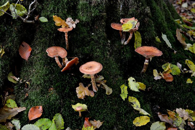 Keywords: mushrooms moss leaves forest forest floor tree stump