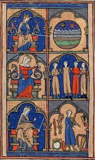 | Keywords: Opdelingen af musikken i hhv. musica mundana, musica humana og musica instrumentalis stammer fra Boethius' (ca. 480–524) værk De institutione musica. Illustrationen her stammer ikke fra Hildegards værker. Den er fra omkring år 1300 og befinder sig på Medici-biblioteket i Firenze. |