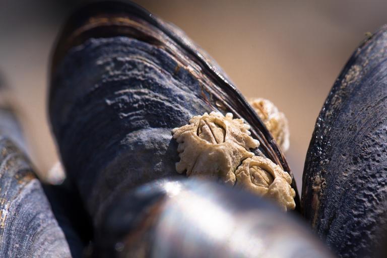 Keywords: mussels barnacles mytilus watt area coastal region grey blue violet shell oval macro