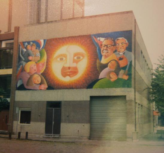 | Keywords: Muurschildering Leeuwarden.jpg Sol Zon muurschildering van de Chileense kunstenaar Jorge Kata Núñez op concertgebouw 'Harmonie' in Leeuwarden Sol Sun wall painting by Chilean artist Jorge Kata Núñez in Leeuwarden the Netherlands own 1987-08-13 Apdency Murals in the Netherlands Buildings in Leeuwarden Monuments and memorials to Salvador Allende Christians from Chile Relations of Chile and the Netherlands Graffiti of sun Sun with faces People with the sun in art 1987 in the Netherlands Graffiti in Leeuwarden Unidentified personalities On the right side of the mural we see what I believe to be a Chilean flag and two persons one of them with a Bible so probably a clergic; the other resembles Salvador Allende I think that might have to do with Chilean history left of the sun there's someone bearing the flag of Friesland the Dutch province of which Leeuwarden is the capital Does anyone know who the depicted Chilean men are |
