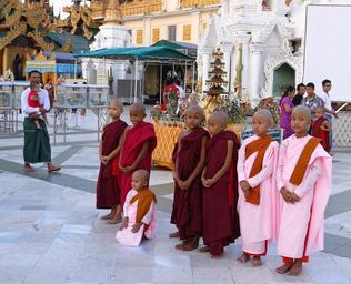 | Keywords: architecture asia bâtiment birman birmanie buddhist burma golden myanmar pagodas rangoon rangoun shwedagon sky stupa temple www.wbayer.com wwwwbayercom La pagode est située à 2 km du centre ville de Yangon, au n°1, Shwedagon Pagoda Road. Elle repose sur une plate-forme pavée de marbre de 5,6 hectares, au sommet de la colline de Singuttara, à 51 m au-dessus de la ville. Elle domine l'horizon. On y accède par des escaliers et des ascenseurs situés aux quatre points cardinaux. Deux chinthes (lions mythiques) monumentaux gardent l'entrée sud ; ils ont été offerts par roi Tharrawaddy lors de sa visite en 18418. La pagode principale se trouve au milieu d'un vaste complexe de 72 autres pagodes, pagodons, salles de prières, tazaungs, pyatthats9 et autres édifices religieux à l'architecture typiquement birmane, ainsi que de très nombreuses statues de bouddhas et de nats. Le stûpa atteint la hauteur de 98 mètres. Sa base est faite de briques recouvertes de milliers de plaques d'or. Elle est entourée d'une forêt de 64 petits pagodons10 qui forment une petite enceinte avec 4 temples plus grands situés aux points cardinaux. Sur la flèche se trouve une sorte d'ombrelle, appelée le hti en birman où sont accrochées 1065 clochettes d'or et 420 clochettes d'argent11, ainsi qu'une girouette ornée de pierres précieuses. Elle se termine par le seinbu, une petite sphère d'or incrustée de milliers de diamants12 dont une émeraude13 de 76 carats. La pagode est située à 2 km du centre ville de Yangon, au n°1, Shwedagon Pagoda Road. Elle repose sur une plate-forme pavée de marbre de 5,6 hectares, au sommet de la colline de Singuttara, à 51 m au-dessus de la ville. Elle domine l'horizon. On y accède par des escaliers et des ascenseurs situés aux quatre points cardinaux. Deux chinthes (lions mythiques) monumentaux gardent l'entrée sud ; ils ont été offerts par roi Tharrawaddy lors de sa visite en 18418. La pagode principale se trouve au milieu d'un vaste complexe de 72 autres pagodes, pagodons, salles de prières, tazaungs, pyatthats9 et autres édifices religieux à l'architecture typiquement birmane, ainsi que de très nombreuses statues de bouddhas et de nats. Le stûpa atteint la hauteur de 98 mètres. Sa base est faite de briques recouvertes de milliers de plaques d'or. Elle est entourée d'une forêt de 64 petits pagodons10 qui forment une petite enceinte avec 4 temples plus grands situés aux points cardinaux. Sur la flèche se trouve une sorte d'ombrelle, appelée le hti en birman où sont accrochées 1065 clochettes d'or et 420 clochettes d'argent11, ainsi qu'une girouette ornée de pierres précieuses. Elle se termine par le seinbu, une petite sphère d'or incrustée de milliers de diamants12 dont une émeraude13 de 76 carats. |