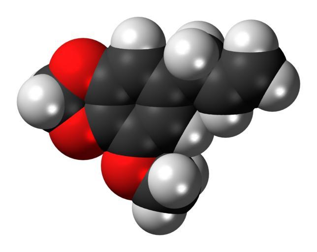 Keywords: Myristicin-3D-spacefill.png Space-filling model of the myristicin molecule a mildly hallucinogenic compound found in nutmeg essential oil Colour code 505050 Grey Carbon C<br> F0F0F0  Hydrogen  H  white<br> F51E1E  Oxygen  O  red<br> 2011-01-22 own DS Visualizer Jynto talk Ball-and-stick version cc-zero Images by Jynto Myristicin
