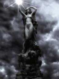 Keywords: mystic statue stone female woman symbol cloudy sky black and white sun burst mystical ancient sculpture spiritual antique mystery medieval historical moody scenery elegance dress era young girl adorable person