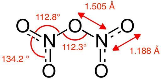 | Keywords: N2O5 from McClelland et al 2001.png Structure with bond lengths and angles of the dinitrogen pentoxide molecule N<sub>2</sub>O<sub>5</sub> as found in the gas phase Structural information determined by gas-phase electron diffraction and computational modelling from B M McClelland A D Richardson K Hedberg A Reinvestigation of the Structure and Torsional Potential of N<sub>2</sub>O<sub>5</sub> by Gas-Phase Electron Diffraction Augmented by Ab Initio Theoretical Calculations Helv Chim Acta 2001 84 1612-1624 Own 2014-06-03 Ben Mills Benjah-bmm27 Images by Ben Mills Dinitrogen pentoxide |