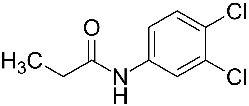 | Keywords: N-(3,4-dichlorophenyl)propionamide 200.svg validSVG Structure of N- 3 4-dichlorophenyl propionamide Struktur von N- 3 4-Dichlorphenyl propionamid Own 2014-04-06 Emeldir <span class signature-talk >talk</span> Chemical structure verified https //upload wikimedia org/wikipedia/commons/d/d1/N- 283 2C4-dichlorophenyl 29propionamide_200 svg 1S/C9H9Cl2NO/c1-2-9 13 12-6-3-4-7 10 8 11 5-6/h3-5H 2H2 1H3 H 12 13 LFULEKSKNZEWOE-UHFFFAOYSA-N 709-98-8 211-914-6 Synonyms <small>3' 4'-Dichloropropionanilide 3' 4'-dichloropropionanilide 3' 4'-DICHLOROPROPIONANILIDE PROPANIL Apronox BAY 30130 Chem rice Chem Rice DCPA DCPA VAN Dichloropropionanilide dichloropropionanilide Dipram Drexel Erban Farmco FW 734 Grascide Montrose propanil N- 3 4-Dichlorophenyl propionamide N- 3 4-Dichlorophenyl -propanamide N- 3 4-Dichlorophenyl propanamide N- 3 4-dichlorophenyl propanamide Prop-Job Propanamide N- 3 4-dichlorophenyl - 9CI Propanex Propanid Propanil Propanil 4 Propanil 4 lb/gal Propionanilide 3' 4'-dichloro- 8CI Propionic acid 3 4-dichloroanilide Prostar Riselect Rogue Rogue R Roque Stam Surcopur Rosanil S 10165 Stam STAM Stam F 34 Stam F-34 Stam LV 10 Stam M-4 Stam m-4 Stam R Stampede StampedeCM Strel Supernox Surcopur Surcopur R Surpur Synpran N WLN GR BG DMV2</small> PD-chem Propanil |