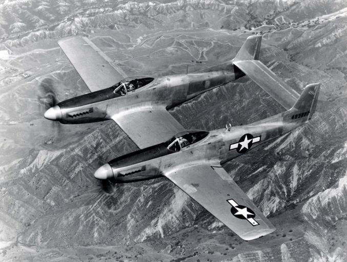 Keywords: naa north american northamerican twin mustang f-82 f82 xf-82 xf82 usaf fighter aircraft airplane vehicle blackandwhite outdoor black and white North American XF-82 (S/N 44-83887) in flight. (U.S. Air Force photo) The F-82 was the last propeller-driven fighter acquired in quantity by the USAF. It appears to be two Mustang fuselages on one wing, but in reality it was a totally new design. Its purpose was to provide a fighter carrying a pilot and co-pilot/navigator to reduce fatigue on long-range bomber escort missions. Delivery from production did not begin until early 1946, too late for World War II. After WWII, radar-equipped F-82s were used quite extensively by the Air Defense Command as replacements for the P-61 night fighter. During the Korean Conflict, Japan-based F-82s were among the first USAF aircraft to operate over Korea. The first three North Korean airplanes destroyed by U.S. forces were shot down by all-weather F-82G interceptors on June 27, 1950. North American XF-82 (S/N 44-83887) in flight. (U.S. Air Force photo) The F-82 was the last propeller-driven fighter acquired in quantity by the USAF. It appears to be two Mustang fuselages on one wing, but in reality it was a totally new design. Its purpose was to provide a fighter carrying a pilot and co-pilot/navigator to reduce fatigue on long-range bomber escort missions. Delivery from production did not begin until early 1946, too late for World War II. After WWII, radar-equipped F-82s were used quite extensively by the Air Defense Command as replacements for the P-61 night fighter. During the Korean Conflict, Japan-based F-82s were among the first USAF aircraft to operate over Korea. The first three North Korean airplanes destroyed by U.S. forces were shot down by all-weather F-82G interceptors on June 27, 1950. |