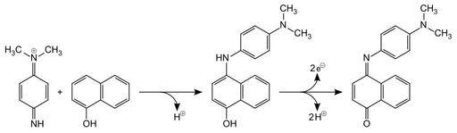 Keywords: NADICoupling.svg validSVG Created with BKchem 001 -check NADI Reaktion oxidative Kopplungsreaktion von 1-Naphthol und N N-Dimethyl-p-phenylendiamin NADI reaction oxidative coupling of 1-naphthol and N N-dimethyl-p-phenylendiamine Own 2010-01-30 Sponk <span class signature-talk >talk</span> PD-chem Reaction mechanisms Naphthol |