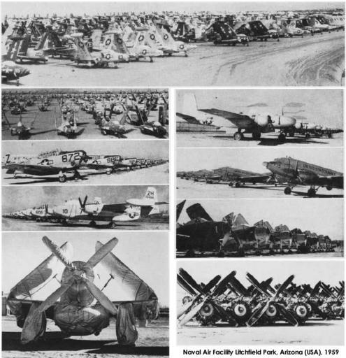 | Keywords: NAF Litchfield Park aircraft storage views 1959.jpg Several views showing stored aircraft at the U S Navy Naval Air Facility Litchfield Park Arizona USA Visilbe are clockwise from the top Grumman F9F Panther and F9F/F-9 Cougar; Douglas JD-1 Invader; Douglas R4D/C-47 Skytrain Douglas AD/A-1 Skyraider; piston engines and propellers; a airborne early warning Skyraider; North American AJ-2 Savage; North American SNJ Texan; and Grumman F9F Panther and F9F/F-9 Cougar U S Navy Naval Aviation News April 1959 http //www history navy mil/nan/backissues/1950s/1959/Apr59 pdf 1959 USN 33 25 25 N 112 22 28 W PD-USGov-Military-Navy Naval Air Facility Litchfield Park |