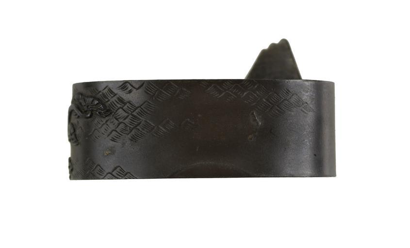 | Keywords: Nagamitsu - Fuchi with Mt Fuji - Walters 511048 - Back.jpg The peak of Mt Fuji rises over the edge of the fuchi on the left side The top is decorated in silver mimicking the snow that often covers the mountain peak Mt Fuji is the most sacred mountain in Japan and is a popular tourist destination Pine trees are shown along the right edges and waves are on the reverse This is part of a set with Walters 51 1047 century 18 19 Edo shibuichi gold cm 3 7 accession number 51 1048 19941 William T / Henry Walters Collection Baltimore date and mode of acquisition unknown Walters Art Museum Henry Walters Acquired by William T or Henry Walters Signature Nagamitsu kao place of origin Japan Walters Art Museum license Fuchi in the Walters Art Museum Media contributed by the Walters Art Museum needs category review Nagamitsu |