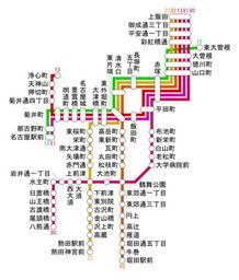 Keywords: Nagoya city tram linemap 01.svg ja 1961年4 時点における名古屋市電の運転系統計27系統のうち 清水口・平田町-赤塚-大曽根- 大曽根・上飯田間(高岳線 部・山口町線・大曽根線・御成 線)で運転される系統(12・13・22・80・81・83号系統)のみを描いた系統路線図 <br /> 新町-清水口間を含めた高岳線全線で運転された系統には他に18・32号系統がある File Nagoya city tram linemap 02 svgをあわせて参照のこと <br />元データの出典: 部重敬 名古屋市電(上) ネコ・パブリッシング 2013年 28頁 own 継之助 2016-08-19 Public transport maps of Nagoya Nagoya City Tram Cc-zero |