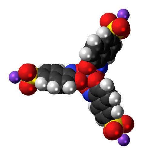 Keywords: Naphthol Green B 3D spacefill.png Space-filling model of the Naphthol Green B molecule a green dye Color code 505050 Carbon C black<br> F0F0F0 Hydrogen H white<br> F51E1E Oxygen O red<br> 3C50FA Nitrogen N blue<br> AA5EF2 Sodium Na lilac<br> FAEB00 Sulfur S yellow<br> 8078C0 Iron Fe grey-purple<br> 2011-07-18 own DS Visualizer Jynto talk Neutral form ball-and-stick version Neutral form space-filling version Sodium salt ball-and-stick version cc-zero Images by Jynto Dyes Iron complexes O-donor complexes Nitroso compounds Naphthalene sulfonates Sodium salts of organic compounds |