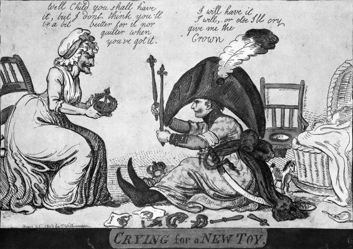 | Keywords: Napoleon-nappy-crying-for-a-new-toy-1803-caricature.jpg Crying for a New Toy a January 25th 1803 satirical caricature attributed to Isaac Cruikshank father of George Cruikshank which portrays Napoleon's planned coronation in a rather undignified light Dialogue in image Old Nurse -- Well Child you shall have it but I don't think you'll be a bit better for it nor quieter when you've got it Nappy -- I will have it I will or else I'll cry -- give me the Crown Potty-training chair in background; torn picture of the world and broken crowns and scepters litter the floor 1803-01-25 not stated creator Isaac Cruikshank PD-old-100 1803 cartoons Isaac Cruikshank Caricatures of Napoleon I of France 1803 in France Bicorne hats in engravings Mob caps Nannies in art Nannies in France |