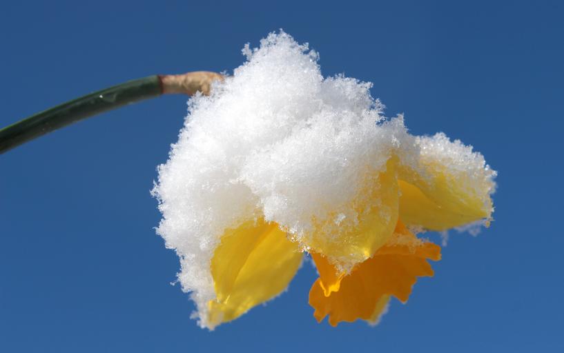 Keywords: narcissus blossom bloom daffodil spring yellow plant snow snow cover cold nature renewed wintereinbruch frost