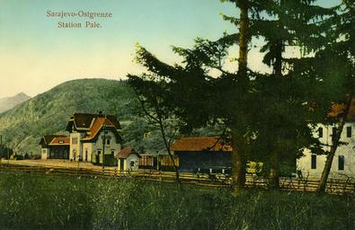 Keywords: Narrow-Gauge-Railway Ostbahn Station-Pale (2).jpg en Narrow-gauge railway station Pale on the line Sarajevo - Vardište - Uvac Old postcard Daniel A Kajon Sarajevo 1906 43 48 45 4 N 18 33 14 3 E heading WNW Bosnian Eastern railway Postcards of Bosnia and Herzegovina Train stations at Bosnian Eastern railway Disused train stations in Republika Srpska Rail transport in Bosnia and Herzegovina in the 1900s Pale PD-old-70-1923 |