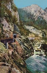 Keywords: Narrow-Gauge-Railway Ostbahn Tunnels-No-47-46 West-of-Mesici.jpg en The eastern portals of the tunnels No 47 and 46 located in the gorge of the Prača River as seen in this upstream view towards Sudići Old postcard Ansichtskarten-Spezialhaus C Cappon Sarajevo Franz Josefstr No 4 1909 43 45 01 7 N 18 58 51 3 E heading W Bosnian Eastern railway Postcards of Bosnia and Herzegovina Rail tunnels in Bosnia and Herzegovina Rail transport in Bosnia and Herzegovina in the 1900s PD-old-70-1923 |