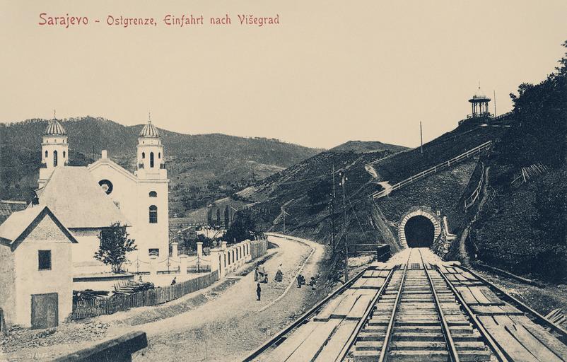 | Keywords: Narrow-Gauge-Railway Ostbahn Tunnel-No-6 Synagogue Visegrad.jpg en The synagogue and the western portal of the tunnel No 6 in Višegrad Old postcard Albert Thier Sarajevo 1910 43 46 53 5 N 19 17 24 E heading ENE Bosnian Eastern railway Postcards of Bosnia and Herzegovina Rail tunnels in Bosnia and Herzegovina Rail transport in Bosnia and Herzegovina in the 1900s Buildings in Višegrad PD-old-70-1923 | ||||