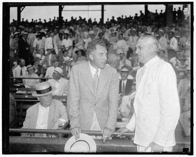 | Keywords: National and American League Presidents Ford Frick (NL left) and William Harridge (AL right) at Washington DC All-Star Game on July 9th 1937.jpg National and American League Prexys Washington D C July 9 Ford Frick left National League Prexy and William Harridge president of the American League they were snapped at the allstar game in the Capitol a few days ago 7/9/37 http //loc gov/pictures/resource/hec 28990/ 1937-07-09 Harris Ewing Collection PD-Harris-Ewing PD-USGov LOC-image hec 28990 1937 Major League Baseball All-Star Game Black and white photographs of Major League Baseball in the 1930s Griffith Stadium Ford Frick William Harridge |