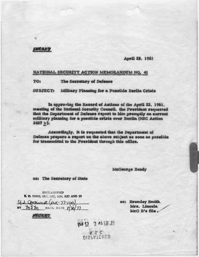 | Keywords: National Security Action Memorandum No. 41Military Planning for a Possible Berlin Crisis - NARA - 193441.tif Scope and content Memorandum for Secretary of Defense military response to possible Berlin crisis General notes 193441 Local identifier President 1961-1963 Kennedy Office of the Special Assistant to the President for National Security Affairs 01/20/1961 - 11/22/1963 NARA-Author Bundy McGeorge 1919-1996 Author 1128212 <br /> John F Kennedy Library NLJFK Columbia Point Boston MA 02125-3398 1961-04-25 Record group Collection JFK-NSF Papers of President Kennedy National Security Files 01/20/1961 - 11/22/1963 Record group ARC 1164 National Security Files Meetings and Memoranda compiled 1961 - 1963 Series ARC 193354 File unit National Security Files Meetings and Memoranda National Security Action Memoranda 02/03/1961 - 11/13/1963 File unit ARC 193400 Variant control numbers NAIL Control Number NLK-NSF-MM-NSAM-10CCCI yes Other versions <gallery> File National_Security_Action_Memorandum_No _41Military_Planning_for_a_Possible_Berlin_Crisis_-_NARA_-_193441 tif tif File National_Security_Action_Memorandum_No _41Military_Planning_for_a_Possible_Berlin_Crisis_-_NARA_-_193441 jpg jpg </gallery> NARA-cooperation PD-USGov Erection of the Berlin Wall 1961 Presidential Decision Directives Kennedy NARA TIF images with categorized JPGs |