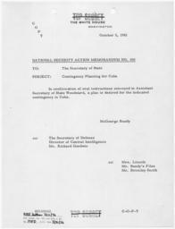 | Keywords: National Security Action Memorandum No. 100 Contingency Planning for Cuba - NARA - 193493.tif Scope and content Memorandum for Secretary of State on contingency planning for Cuba General notes 193493 Local identifier President 1961-1963 Kennedy Office of the Special Assistant to the President for National Security Affairs 01/20/1961 - 11/22/1963 NARA-Author Bundy McGeorge 1919-1996 Author 1128212 <br /> John F Kennedy Library NLJFK Columbia Point Boston MA 02125-3398 1961-10-05 Record group Collection JFK-NSF Papers of President Kennedy National Security Files 01/20/1961 - 11/22/1963 Record group ARC 1164 National Security Files Meetings and Memoranda compiled 1961 - 1963 Series ARC 193354 File unit National Security Files Meetings and Memoranda National Security Action Memoranda 02/03/1961 - 11/13/1963 File unit ARC 193400 Variant control numbers NAIL Control Number NLK-NSF-MM-NSAM-10EEEC yes Other versions <gallery> File National_Security_Action_Memorandum_No _100_Contingency_Planning_for_Cuba_-_NARA_-_193493 tif tif File National_Security_Action_Memorandum_No _100_Contingency_Planning_for_Cuba_-_NARA_-_193493 jpg jpg </gallery> NARA-cooperation PD-USGov Presidential Decision Directives Kennedy NARA TIF images with categorized JPGs |