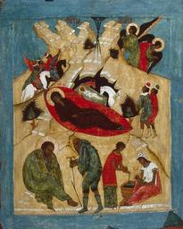 Keywords: Nativity, poss. Moscow school (16th c., Hermitage).jpg Икона 'Рождество Х истово' Россия XVI в Икона Рождество Х истово написанная в XVI в входила в так называемый п аздничный яд иконостаса включающий иконы с изоб ажением сцен из жизни Х иста и Бого одицы Иконог афия сюжета Рождество Х истово сложилась ко вто ой половине XVI в а этой иконе лаконично изоб ажено несколько сцен описанных в Евангелии В цент е композиции п едставлено Рождество Х истово по свету путеводной звезды нап авляются т и всадника - восточных ца я волхва ; ангел пе едает весть о ождении Х иста пастухам Внизу показаны Иосиф и ста ик в зве иной шку е а также сцена омовения ладенца В живописной мане е можно п оследить че ты п исущие аботам Анд ея Рублева начало XV в осковский масте об атился к наследию этого великого д евне усского художника спустя более 100 лет после его сме ти что было ха акте ным для всей московской школы Отличительной че той иконы является едко вст ечаемый в усской иконописи голубой фон Школа осковская азвание Икона 'Рождество Х истово' есто создания Россия В емя создания XVI в Техника де ево паволока левкас темпе а позолота Разме ы 56x44 5 см Поступление Поступил в 1955 г П иоб етен у частного лица Инвента ный номе ЭРИ-196 http //hermitagemuseum org/wps/portal/hermitage/digital-collection/01 20paintings/568579/ ut/p/a1/lVHLboMwEPwVeuDornkZOCISVYpEaamqYF-QeYQ4AUPAadq_r5F6aA9pmz3tSrOzM7PAIAcm-ZtouRKD5N0yM1KkUUQsJ8abNPZWOEqzJy-LHx-w5cIWGLBOtkCn89JWUo1qD_TIezEX09nEl2E6zsawM_ikTIyte2PkQioh29nEHgk8P1wWx0rUQGvbcXnl2qjkoY_coKkRt30flQRbZVOSmoSVFkW1KHylIvwvzb8zUH3Cv8ZBEhteFo5tnBTPr-tMo79FcIOTzV9StVV7SuKk1bRc7ZGQuwHyHyFC_hWixorD6cQi_YVBquZdQX7bG8a-D5we5RhxGjhed_i43H0CdCEcyg /dl5/d5/L2dBISEvZ0FBIS9nQSEh/ lng ru 16th c 16 Icons of Nativity in Russia Files uploaded by Shakko from various sources Icons in Hermitage PD-old