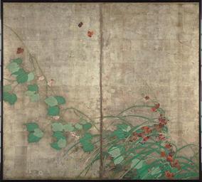 Keywords: Natsu aki kusa-zu byobu 2.jpg LargeImage Artwork en Depicted is the left part of the pair of two-fold screens Summer and autumn flower plants showing an autumn scene plants swaying and red ivy leaves blown in a strong wind ja 酒井抱 の 屏風 風雨草花図 ( 称 夏秋草図屏風 左隻のみ) century 19 color silver undercoat Size cm 164 5 181 8 Institution Tokyo National Museum object history This piece was originally part of a two-sided folding screen with Ogata Kōrin's Wind God and Thunder God on one side and Sakai Hōitsu's Summer and autumn flower plants on the opposite side It was recently reformed into a pair of two-fold screens to protect it from damage in black ja by Hōitsu in red text surrounded by a red circle ja Bunsen was another name of Hōitsu Bunsen On the back of this screen is a painting of the Wind God by Ogata Kōrin accession number A-11189 http //www emuseum jp/detail/100321/002/004 word raijin d_lang en s_lang en class title c_e region era cptype owner pos 1 num 1 mode simple century Emuseum PD-old-100 thumb left right screen summer plants thumb reverse of this screen thumb reverse of the summer plants screen Sakai Hoitsu 19th-century paintings Rimpa school paintings Paintings of plants Paintings on screens from Japan Important Cultural Property of Japan in Tokyo Hedera in art Paintings of autumn |