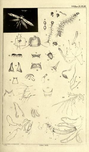 Keywords: Naturalhistoryre02dubl 0281.jpg en Natural History Review PROCEEDINGS OF SOCIETIES PLATE 4 VOL II ELACHISTA TRISERIATELLA 1 The natural size 2 Magnified Vide Proceedings of Societies pages 116-124 and pages 109-115 The remaining figures to illustrate Mr Halitlay's paper on Ptilex not in time for the Proceedings of this No ; see the No for January 1856 3 Larva slightly magnified 4 Do more magnified 5 Rachidian chain 6 Two-niter mediate ganglia 7 Intestinal canal with head 8-9 Rudiments of generative system 10 Head side view 13 Do from above 14 Antenna 11 Epistoma from above 12 Fore part of head from below 15 Mandibles closed c 1 6 Palpus under mandible 17 Palpus detached 18 Mandibles extracted 19 Intermediate segment of above 20 Do -r-side view 21 Hinder part of body 22 Upper edge of anal declivity 23 Terminal hooks from below 24 Intestinal canal 25 Grapplers of male 26 Internal organs do 27 Vesicles apart 28 Ovident and ovarv of female 2011-09-20 Biodiversity Heritage Library Authur Riky Hogan PD-old-100 Uploaded with UploadWizard Hogan Natural History Review |