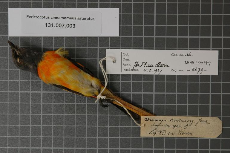 | Keywords: Naturalis Biodiversity Center - RMNH.AVES.124199 2 - Pericrocotus cinnamomeus saturatus Stuart Baker, 1920 - Campephagidae - bird skin specimen.jpeg artwork Dimensions artwork Document type Campephagidae Pericrocotus Individual count 1 Infraspecific epithet saturatus Infraspecific rank Institution Naturalis Kind of unit artwork Kind of unit specimen skin Life stage Indonesia Java Dramaga Buitenzorg Medium artwork Nomenclatural code Occurrence ID page Other fields Other versions artwork Permission license Naturalis donation CC-0 Publication location Scientific name Pericrocotus cinnamomeus saturatus Stuart Baker 1920 Scientific name authorship Stuart Baker 1920 male Source url http //bioportal naturalis nl Specific epithet cinnamomeus State or province Subject keywords artwork Subject keywords publication Title artwork Title publication Type status Uploaded with GWToolset Naturalis_Biodiversity_Center_-_RMNH AVES 124199_2_-_Pericrocotus_cinnamomeus_saturatus_Stuart_Baker _1920_-_Campephagidae_-_bird_skin_specimen http //medialib naturalis nl/file/id/RMNH AVES 124199_2/format/large Media donated by Naturalis Biodiversity Center Songbird specimens at Naturalis Biodiversity Center Pericrocotus cinnamomeus museum specimens |