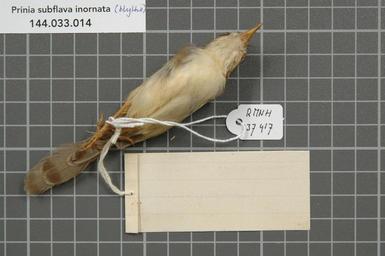 Keywords: Naturalis Biodiversity Center - RMNH.AVES.137417 2 - Prinia subflava inornata Sykes, 1832 - Sylviidae - bird skin specimen.jpeg artwork Dimensions artwork Document type Sylviidae Prinia Individual count 1 Infraspecific epithet inornata Infraspecific rank Institution Naturalis Kind of unit artwork Kind of unit specimen skin Life stage adult Indonesia Java Surabaja Medium artwork Nomenclatural code Additional identification info ohne Namen Occurrence ID page Other fields Other versions artwork Permission license Naturalis donation CC-0 Publication location Scientific name Prinia subflava inornata Sykes 1832 Scientific name authorship Sykes 1832 Source url http //bioportal naturalis nl Specific epithet subflava State or province Subject keywords artwork Subject keywords publication Title artwork Title publication Type status Uploaded with GWToolset Naturalis_Biodiversity_Center_-_RMNH AVES 137417_2_-_Prinia_subflava_inornata_Sykes _1832_-_Sylviidae_-_bird_skin_specimen http //medialib naturalis nl/file/id/RMNH AVES 137417_2/format/large Media donated by Naturalis Biodiversity Center Songbird specimens at Naturalis Biodiversity Center Prinia subflava Prinia |