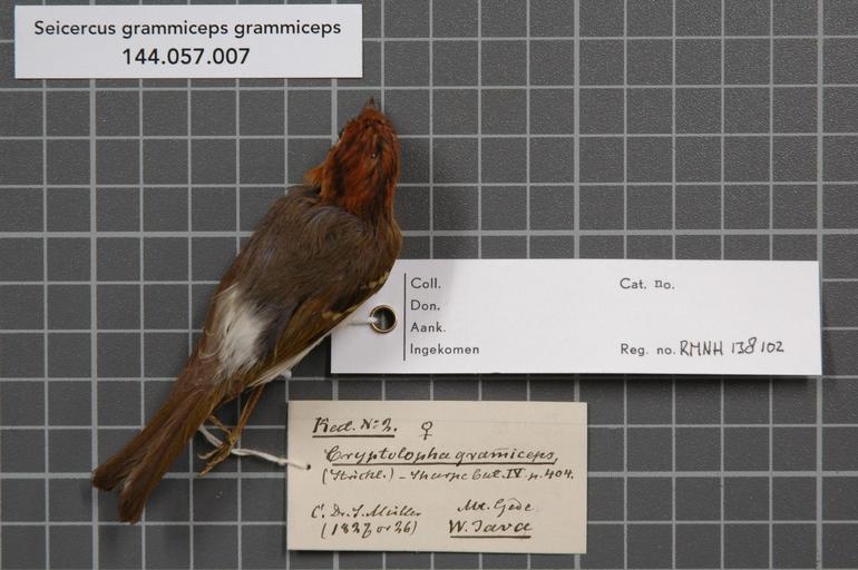 Keywords: Naturalis Biodiversity Center - RMNH.AVES.138102 1 - Seicercus grammiceps grammiceps (Strickland, 1849) - Sylviidae - bird skin specimen.jpeg artwork Dimensions artwork Document type Sylviidae Seicercus Individual count 1 Infraspecific epithet grammiceps Infraspecific rank Institution Naturalis Kind of unit artwork Kind of unit specimen skin Life stage Indonesia W Java Mt Gede Medium artwork Nomenclatural code Check type Additional identification info Sylvia leucorrhoa Müller Blyth 1870 name not available ICZN 2000 Art 11 6 R Dekker 30 V 2001 Additional label info Type of Sylvia leucorrhos Müll n sp Blyth Ibis 1870 p 169 female Mount Gedé Java old label by Temminck Occurrence ID page Other fields Other versions artwork Permission license Naturalis donation CC-0 Publication location Scientific name Seicercus grammiceps grammiceps Strickland 1849 Scientific name authorship Strickland 1849 female Source url http //bioportal naturalis nl Specific epithet grammiceps State or province W Java Subject keywords artwork Subject keywords publication Title artwork Title publication Type status Uploaded with GWToolset Naturalis_Biodiversity_Center_-_RMNH AVES 138102_1_-_Seicercus_grammiceps_grammiceps_ Strickland _1849 _-_Sylviidae_-_bird_skin_specimen http //medialib naturalis nl/file/id/RMNH AVES 138102_1/format/large Media donated by Naturalis Biodiversity Center Songbird specimens at Naturalis Biodiversity Center Seicercus grammiceps |