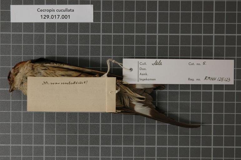 | Keywords: Naturalis Biodiversity Center - RMNH.AVES.125123 2 - Cecropis cucullata (Boddaert, 1783) - Hirundinidae - bird skin specimen.jpeg artwork Dimensions artwork Document type Hirundinidae Cecropis Individual count 1 Infraspecific epithet Infraspecific rank Institution Naturalis Kind of unit artwork Kind of unit specimen skin Life stage Z W Afrika Mossamedes Medium artwork Nomenclatural code Additional identification info NB War unbestimmt Sex remark female Coll Occurrence ID page Other fields Other versions artwork Permission license Naturalis donation CC-0 Publication location Scientific name Cecropis cucullata Boddaert 1783 Scientific name authorship Boddaert 1783 female Source url http //bioportal naturalis nl Specific epithet cucullata State or province Subject keywords artwork Subject keywords publication Title artwork Title publication Type status Uploaded with GWToolset Naturalis_Biodiversity_Center_-_RMNH AVES 125123_2_-_Cecropis_cucullata_ Boddaert _1783 _-_Hirundinidae_-_bird_skin_specimen http //medialib naturalis nl/file/id/RMNH AVES 125123_2/format/large Media donated by Naturalis Biodiversity Center Songbird specimens at Naturalis Biodiversity Center Cecropis cucullata museum specimens |
