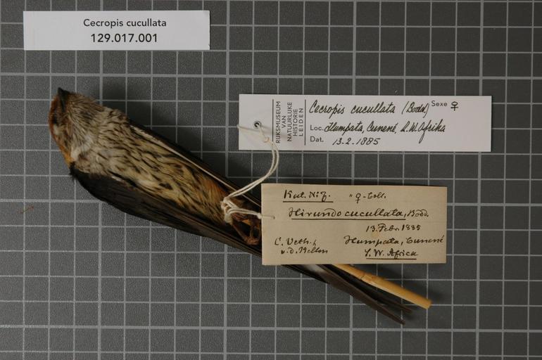 | Keywords: Naturalis Biodiversity Center - RMNH.AVES.125125 1 - Cecropis cucullata (Boddaert, 1783) - Hirundinidae - bird skin specimen.jpeg artwork Dimensions artwork Document type Hirundinidae Cecropis Individual count 1 Infraspecific epithet Infraspecific rank Institution Naturalis Kind of unit artwork Kind of unit specimen skin Life stage Z W Afrika Cunené Humpata Medium artwork Nomenclatural code Sex remark female Coll Occurrence ID page Other fields Other versions artwork Permission license Naturalis donation CC-0 Publication location Scientific name Cecropis cucullata Boddaert 1783 Scientific name authorship Boddaert 1783 female Source url http //bioportal naturalis nl Specific epithet cucullata State or province Cunené Subject keywords artwork Subject keywords publication Title artwork Title publication Type status Uploaded with GWToolset Naturalis_Biodiversity_Center_-_RMNH AVES 125125_1_-_Cecropis_cucullata_ Boddaert _1783 _-_Hirundinidae_-_bird_skin_specimen http //medialib naturalis nl/file/id/RMNH AVES 125125_1/format/large Media donated by Naturalis Biodiversity Center Songbird specimens at Naturalis Biodiversity Center Cecropis cucullata museum specimens |