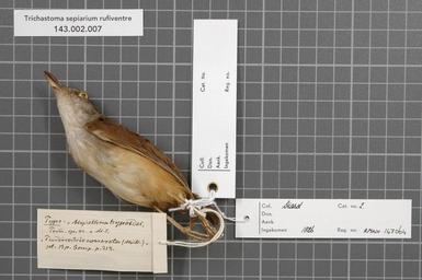 Keywords: Naturalis Biodiversity Center - RMNH.AVES.147064 2 - Trichastoma sepiarium rufiventre (Salvadori, 1874) - Timaliidae - bird skin specimen.jpeg artwork Dimensions artwork Document type Timaliidae Trichastoma Individual count 1 Infraspecific epithet rufiventre Infraspecific rank Institution Naturalis Kind of unit artwork Kind of unit specimen skin Life stage Indonesia Borneo Pontianak Medium artwork Nomenclatural code Check type ADDITIONAL identification info hypoides Temm MS name concreta Bp nomen nudum R Dekker 20 VI 2001 Sex remark On original label female lab Occurrence ID page Other fields Other versions artwork Permission license Naturalis donation CC-0 Publication location Scientific name Trichastoma sepiarium rufiventre Salvadori 1874 Scientific name authorship Salvadori 1874 female Source url http //bioportal naturalis nl Specific epithet sepiarium State or province Subject keywords artwork Subject keywords publication Title artwork Title publication Type status Uploaded with GWToolset Naturalis_Biodiversity_Center_-_RMNH AVES 147064_2_-_Trichastoma_sepiarium_rufiventre_ Salvadori _1874 _-_Timaliidae_-_bird_skin_specimen http //medialib naturalis nl/file/id/RMNH AVES 147064_2/format/large Media donated by Naturalis Biodiversity Center Songbird specimens at Naturalis Biodiversity Center Trichastoma Trichastoma sepiarium |