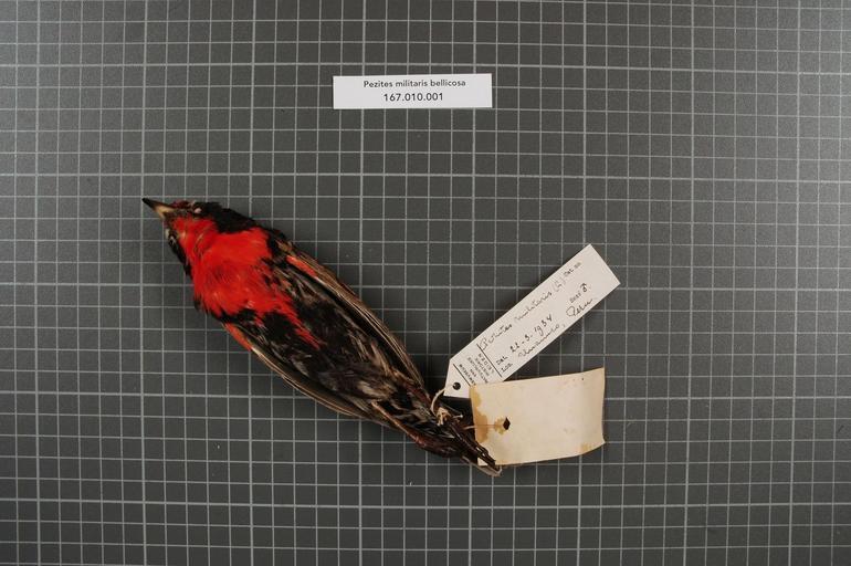 | Keywords: Naturalis Biodiversity Center - RMNH.AVES.153554 2 - Pezites militaris bellicosa (Filippi, 1847) - Icteridae - bird skin specimen.jpeg artwork Dimensions artwork Document type Icteridae Pezites Individual count 1 Infraspecific epithet bellicosa Infraspecific rank Institution Naturalis Kind of unit artwork Kind of unit specimen skin Life stage Peru Huanuco Medium artwork Nomenclatural code Occurrence ID page Other fields Other versions artwork Permission license Naturalis donation CC-0 Publication location Scientific name Pezites militaris bellicosa Filippi 1847 Scientific name authorship Filippi 1847 male Source url http //bioportal naturalis nl Specific epithet militaris State or province Subject keywords artwork Subject keywords publication Title artwork Title publication Type status Uploaded with GWToolset Naturalis_Biodiversity_Center_-_RMNH AVES 153554_2_-_Pezites_militaris_bellicosa_ Filippi _1847 _-_Icteridae_-_bird_skin_specimen http //medialib naturalis nl/file/id/RMNH AVES 153554_2/format/large Media donated by Naturalis Biodiversity Center Songbird specimens at Naturalis Biodiversity Center Pezites militaris Pezites |