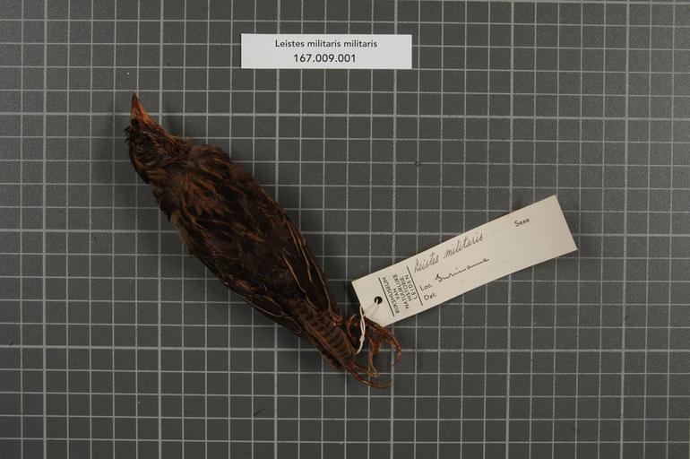 | Keywords: Naturalis Biodiversity Center - RMNH.AVES.25583 2 - Leistes militaris militaris (Linnaeus, 1758) - Icteridae - bird skin specimen.jpeg artwork Dimensions artwork Document type Icteridae Leistes Individual count 1 Infraspecific epithet militaris Infraspecific rank Institution Naturalis Kind of unit artwork Kind of unit specimen skin Life stage Suriname Medium artwork Nomenclatural code Occurrence ID page Other fields Other versions artwork Permission license Naturalis donation CC-0 Publication location Scientific name Leistes militaris militaris Linnaeus 1758 Scientific name authorship Linnaeus 1758 Source url http //bioportal naturalis nl Specific epithet militaris State or province Subject keywords artwork Subject keywords publication Title artwork Title publication Type status Uploaded with GWToolset Naturalis_Biodiversity_Center_-_RMNH AVES 25583_2_-_Leistes_militaris_militaris_ Linnaeus _1758 _-_Icteridae_-_bird_skin_specimen http //medialib naturalis nl/file/id/RMNH AVES 25583_2/format/large Media donated by Naturalis Biodiversity Center Songbird specimens at Naturalis Biodiversity Center Sturnella militaris |