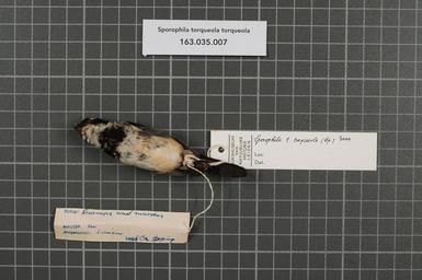 | Keywords: Naturalis Biodiversity Center - RMNH.AVES.35074 2 - Sporophila torqueola torqueola (Bonaparte, 1851) - Emberizidae - bird skin specimen.jpeg artwork Dimensions artwork Document type Emberizidae Sporophila Individual count 1 Infraspecific epithet torqueola Infraspecific rank Institution Naturalis Kind of unit artwork Kind of unit specimen skin Life stage Oaxaca Loma Bonita Rancho Las Vegas Medium artwork Nomenclatural code Bodily condition Fett I Occurrence ID page Other fields Other versions artwork Permission license Naturalis donation CC-0 Publication location Scientific name Sporophila torqueola torqueola Bonaparte 1851 Scientific name authorship Bonaparte 1851 male Source url http //bioportal naturalis nl Specific epithet torqueola State or province Oaxaca Subject keywords artwork Subject keywords publication Title artwork Title publication Type status Uploaded with GWToolset Naturalis_Biodiversity_Center_-_RMNH AVES 35074_2_-_Sporophila_torqueola_torqueola_ Bonaparte _1851 _-_Emberizidae_-_bird_skin_specimen http //medialib naturalis nl/file/id/RMNH AVES 35074_2/format/large Media donated by Naturalis Biodiversity Center Songbird specimens at Naturalis Biodiversity Center Sporophila torqueola Sporophila |