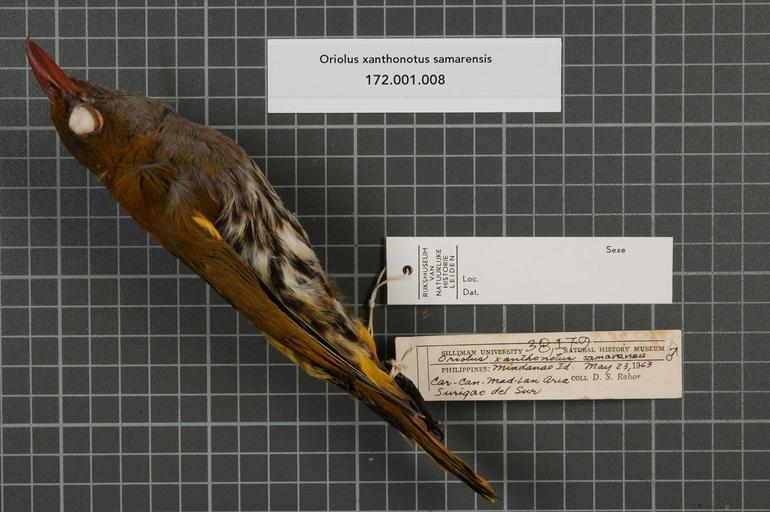 Keywords: Naturalis Biodiversity Center - RMNH.AVES.35597 1 - Oriolus xanthonotus samarensis Steere, 1890 - Oriolidae - bird skin specimen.jpeg artwork Dimensions artwork Document type Oriolidae Oriolus Individual count 1 Infraspecific epithet samarensis Infraspecific rank Institution Naturalis Kind of unit artwork Kind of unit specimen skin Life stage Philippines Mindanao ID Car-can-mad-Lan Aria Surigao del Sur Medium artwork Nomenclatural code ADDITIONAL label info Silliman University Natural History Museum Occurrence ID page Other fields Other versions artwork Permission license Naturalis donation CC-0 Publication location Scientific name Oriolus xanthonotus samarensis Steere 1890 Scientific name authorship Steere 1890 male Source url http //bioportal naturalis nl Specific epithet xanthonotus State or province Mindanao ID Subject keywords artwork Subject keywords publication Title artwork Title publication Type status Uploaded with GWToolset Naturalis_Biodiversity_Center_-_RMNH AVES 35597_1_-_Oriolus_xanthonotus_samarensis_Steere _1890_-_Oriolidae_-_bird_skin_specimen http //medialib naturalis nl/file/id/RMNH AVES 35597_1/format/large Media donated by Naturalis Biodiversity Center Songbird specimens at Naturalis Biodiversity Center Oriolus xanthonotus Oriolus |