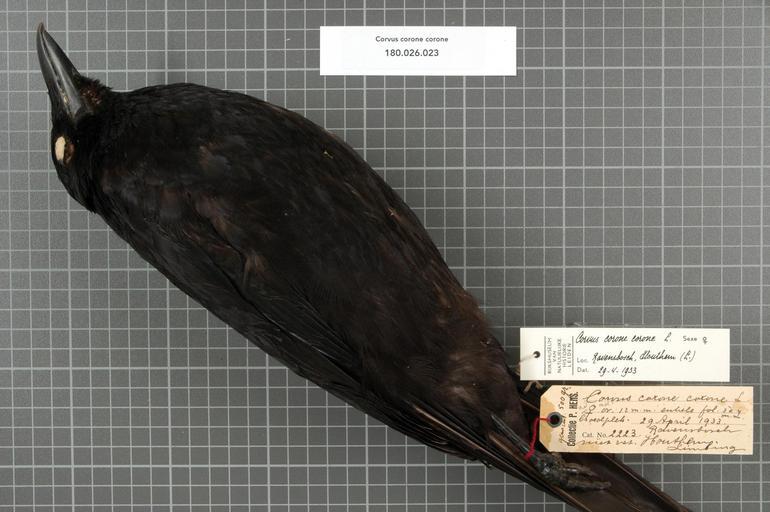 | Keywords: Naturalis Biodiversity Center - RMNH.AVES.56281 1 - Corvus corone corone Linnaeus, 1758 - Corvidae - bird skin specimen.jpeg artwork Dimensions artwork Document type Corvidae Corvus Individual count 1 Infraspecific epithet corone Infraspecific rank Institution Naturalis Kind of unit artwork Kind of unit specimen skin Life stage adult Netherlands Limburg Houthem Ravensbosch Medium artwork Nomenclatural code Bodily condition niet vet ADDITIONAL info remark Word unreadable Occurrence ID page Other fields Other versions artwork Permission license Naturalis donation CC-0 Publication location Scientific name Corvus corone corone Linnaeus 1758 Scientific name authorship Linnaeus 1758 female Source url http //bioportal naturalis nl Specific epithet corone State or province Limburg Subject keywords artwork Subject keywords publication Title artwork Title publication Type status Uploaded with GWToolset Naturalis_Biodiversity_Center_-_RMNH AVES 56281_1_-_Corvus_corone_corone_Linnaeus _1758_-_Corvidae_-_bird_skin_specimen http //medialib naturalis nl/file/id/RMNH AVES 56281_1/format/large Media donated by Naturalis Biodiversity Center Songbird specimens at Naturalis Biodiversity Center Corvus corone Corvus |