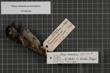 Keywords: Naturalis Biodiversity Center - RMNH.AVES.57204 1 - Passer domesticus domesticus (Linnaeus, 1758) - Ploceidae - bird skin specimen.jpeg artwork Dimensions artwork Document type Ploceidae Passer Individual count 1 Infraspecific epithet domesticus Infraspecific rank Institution Naturalis Kind of unit artwork Kind of unit specimen skin Life stage Portugal bij Setubal Z van Lissabon Medium artwork Nomenclatural code Locality remark On old label Bij Setubal z/v Lissabon Occurrence ID page Other fields Other versions artwork Permission license Naturalis donation CC-0 Publication location Scientific name Passer domesticus domesticus Linnaeus 1758 Scientific name authorship Linnaeus 1758 male Source url http //bioportal naturalis nl Specific epithet domesticus State or province Subject keywords artwork Subject keywords publication Title artwork Title publication Type status Uploaded with GWToolset Naturalis_Biodiversity_Center_-_RMNH AVES 57204_1_-_Passer_domesticus_domesticus_ Linnaeus _1758 _-_Ploceidae_-_bird_skin_specimen http //medialib naturalis nl/file/id/RMNH AVES 57204_1/format/large Media donated by Naturalis Biodiversity Center Songbird specimens at Naturalis Biodiversity Center Passer domesticus Passer |