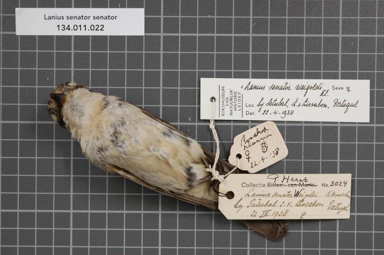 Keywords: Naturalis Biodiversity Center - RMNH.AVES.58012 1 - Lanius senator senator Linnaeus, 1758 - Laniidae - bird skin specimen.jpeg artwork Dimensions artwork Document type Laniidae Lanius Individual count 1 Infraspecific epithet senator Infraspecific rank Institution Naturalis Kind of unit artwork Kind of unit specimen skin Life stage Portugal bij Setubal Z van Lissabon Medium artwork Nomenclatural code Country remark On RMNH label Portugul Occurrence ID page Other fields Other versions artwork Permission license Naturalis donation CC-0 Publication location Scientific name Lanius senator senator Linnaeus 1758 Scientific name authorship Linnaeus 1758 female Source url http //bioportal naturalis nl Specific epithet senator State or province Subject keywords artwork Subject keywords publication Title artwork Title publication Type status Uploaded with GWToolset Naturalis_Biodiversity_Center_-_RMNH AVES 58012_1_-_Lanius_senator_senator_Linnaeus _1758_-_Laniidae_-_bird_skin_specimen http //medialib naturalis nl/file/id/RMNH AVES 58012_1/format/large Media donated by Naturalis Biodiversity Center Songbird specimens at Naturalis Biodiversity Center Lanius senator Lanius |