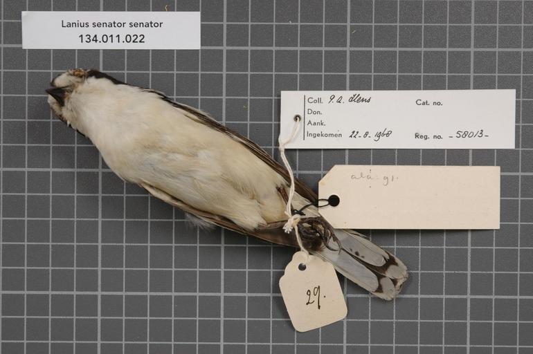 Keywords: Naturalis Biodiversity Center - RMNH.AVES.58013 2 - Lanius senator senator Linnaeus, 1758 - Laniidae - bird skin specimen.jpeg artwork Dimensions artwork Document type Laniidae Lanius Individual count 1 Infraspecific epithet senator Infraspecific rank Institution Naturalis Kind of unit artwork Kind of unit specimen skin Life stage Portugal bij Setubal Z van Lissabon Medium artwork Nomenclatural code Occurrence ID page Other fields Other versions artwork Permission license Naturalis donation CC-0 Publication location Scientific name Lanius senator senator Linnaeus 1758 Scientific name authorship Linnaeus 1758 male Source url http //bioportal naturalis nl Specific epithet senator State or province Subject keywords artwork Subject keywords publication Title artwork Title publication Type status Uploaded with GWToolset Naturalis_Biodiversity_Center_-_RMNH AVES 58013_2_-_Lanius_senator_senator_Linnaeus _1758_-_Laniidae_-_bird_skin_specimen http //medialib naturalis nl/file/id/RMNH AVES 58013_2/format/large Media donated by Naturalis Biodiversity Center Songbird specimens at Naturalis Biodiversity Center Lanius senator Lanius |
