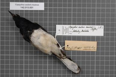 | Keywords: Naturalis Biodiversity Center - RMNH.AVES.129296 1 - Copsychus saularis musicus (Raffles, 1822) - Turdidae - bird skin specimen.jpeg artwork Dimensions artwork Document type Turdidae Copsychus Individual count 1 Infraspecific epithet musicus Infraspecific rank Institution Naturalis Kind of unit artwork Kind of unit specimen skin Life stage Medium artwork Nomenclatural code Sex remark On RMNH label male Occurrence ID page Other fields Other versions artwork Permission license Naturalis donation CC-0 Publication location Scientific name Copsychus saularis musicus Raffles 1822 Scientific name authorship Raffles 1822 male Source url http //bioportal naturalis nl Specific epithet saularis State or province Malacca Wellesley Subject keywords artwork Subject keywords publication Title artwork Title publication Type status Uploaded with GWToolset Naturalis_Biodiversity_Center_-_RMNH AVES 129296_1_-_Copsychus_saularis_musicus_ Raffles _1822 _-_Turdidae_-_bird_skin_specimen http //medialib naturalis nl/file/id/RMNH AVES 129296_1/format/large Media donated by Naturalis Biodiversity Center Songbird specimens at Naturalis Biodiversity Center Copsychus saularis museum specimens |