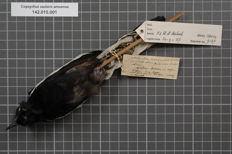 | Keywords: Naturalis Biodiversity Center - RMNH.AVES.129424 2 - Copsychus saularis amoenus (Horsfield, 1821) - Turdidae - bird skin specimen.jpeg artwork Dimensions artwork Document type Turdidae Copsychus Individual count 1 Infraspecific epithet amoenus Infraspecific rank Institution Naturalis Kind of unit artwork Kind of unit specimen skin Life stage Medium artwork Nomenclatural code Occurrence ID page Other fields Other versions artwork Permission license Naturalis donation CC-0 Publication location Scientific name Copsychus saularis amoenus Horsfield 1821 Scientific name authorship Horsfield 1821 male Source url http //bioportal naturalis nl Specific epithet saularis State or province Java Res Semarang Subject keywords artwork Subject keywords publication Title artwork Title publication Type status Uploaded with GWToolset Naturalis_Biodiversity_Center_-_RMNH AVES 129424_2_-_Copsychus_saularis_amoenus_ Horsfield _1821 _-_Turdidae_-_bird_skin_specimen http //medialib naturalis nl/file/id/RMNH AVES 129424_2/format/large Media donated by Naturalis Biodiversity Center Songbird specimens at Naturalis Biodiversity Center Copsychus saularis museum specimens |