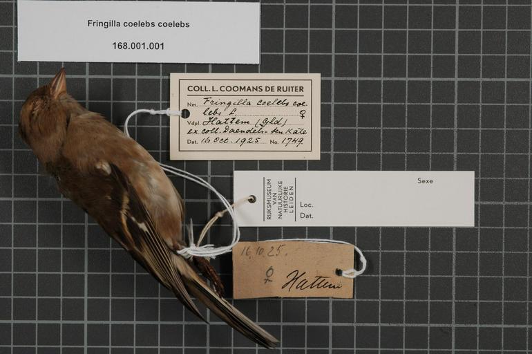 Keywords: Naturalis Biodiversity Center - RMNH.AVES.60698 1 - Fringilla coelebs coelebs Linnaeus, 1758 - Fringillidae - bird skin specimen.jpeg artwork Dimensions artwork Document type Fringillidae Fringilla Individual count 1 Infraspecific epithet coelebs Infraspecific rank Institution Naturalis Kind of unit artwork Kind of unit specimen skin Life stage Netherlands Gelderland Hattem Medium artwork Nomenclatural code Region remark On Coomans label Gld Occurrence ID page Other fields Other versions artwork Permission license Naturalis donation CC-0 Publication location Scientific name Fringilla coelebs coelebs Linnaeus 1758 Scientific name authorship Linnaeus 1758 female Source url http //bioportal naturalis nl Specific epithet coelebs State or province Gelderland Subject keywords artwork Subject keywords publication Title artwork Title publication Type status Uploaded with GWToolset Naturalis_Biodiversity_Center_-_RMNH AVES 60698_1_-_Fringilla_coelebs_coelebs_Linnaeus _1758_-_Fringillidae_-_bird_skin_specimen http //medialib naturalis nl/file/id/RMNH AVES 60698_1/format/large Media donated by Naturalis Biodiversity Center Songbird specimens at Naturalis Biodiversity Center Fringilla coelebs Fringilla