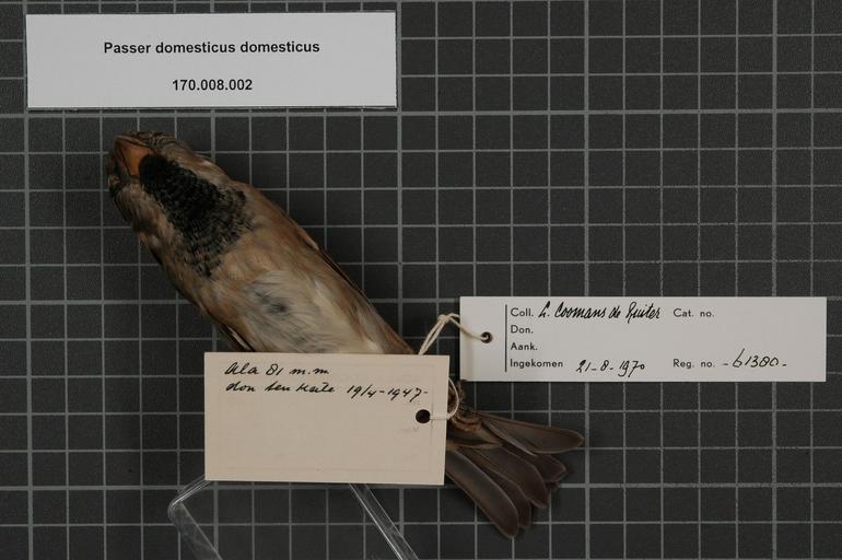 Keywords: Naturalis Biodiversity Center - RMNH.AVES.61380 2 - Passer domesticus domesticus (Linnaeus, 1758) - Ploceidae - bird skin specimen.jpeg artwork Dimensions artwork Document type Ploceidae Passer Individual count 1 Infraspecific epithet domesticus Infraspecific rank Institution Naturalis Kind of unit artwork Kind of unit specimen skin Life stage Netherlands Overijssel Hattem Medium artwork Nomenclatural code Region remark On Coomans label overysel Occurrence ID page Other fields Other versions artwork Permission license Naturalis donation CC-0 Publication location Scientific name Passer domesticus domesticus Linnaeus 1758 Scientific name authorship Linnaeus 1758 male Source url http //bioportal naturalis nl Specific epithet domesticus State or province Overijssel Subject keywords artwork Subject keywords publication Title artwork Title publication Type status Uploaded with GWToolset Naturalis_Biodiversity_Center_-_RMNH AVES 61380_2_-_Passer_domesticus_domesticus_ Linnaeus _1758 _-_Ploceidae_-_bird_skin_specimen http //medialib naturalis nl/file/id/RMNH AVES 61380_2/format/large Media donated by Naturalis Biodiversity Center Songbird specimens at Naturalis Biodiversity Center Passer domesticus Passer |