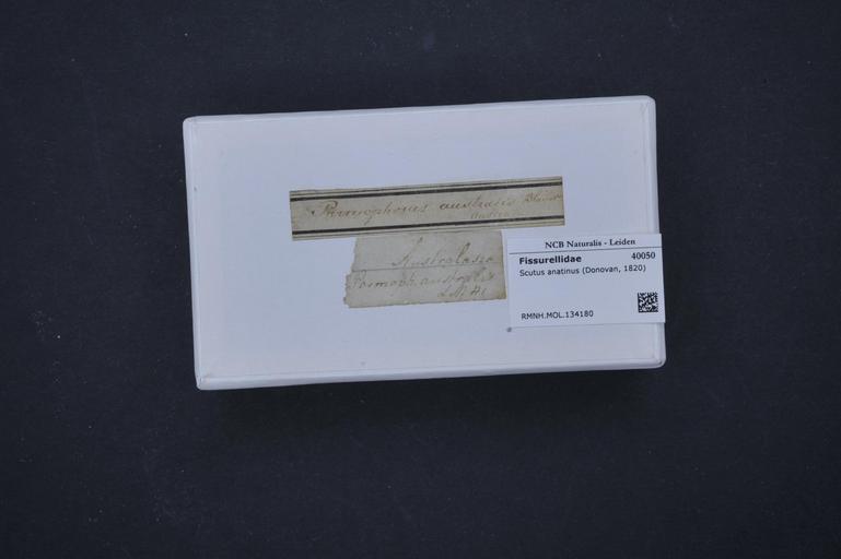Keywords: Naturalis Biodiversity Center - RMNH.MOL.134180 1 - Scutus anatinus (Donovan, 1820) - Fissurellidae - Mollusc shell.jpeg artwork Dimensions artwork Document type Fissurellidae subfamily Emarginulinae Scutus Individual count Infraspecific epithet Infraspecific rank Institution Naturalis Kind of unit artwork Kind of unit specimen shell Life stage Medium artwork Nomenclatural code Source institute Leiden Scale the width of the text on the species/QR-code label is 38 mm Occurrence ID page Other fields Other versions artwork Permission license Naturalis donation CC-0 Mollusca Publication location Scientific name Scutus anatinus Donovan 1820 Scientific name authorship Donovan 1820 Source url http //bioportal naturalis nl Specific epithet anatinus State or province Subject keywords artwork Subject keywords publication Title artwork Title publication Type status Uploaded with GWToolset Naturalis_Biodiversity_Center_-_RMNH MOL 134180_1_-_Scutus_anatinus_ Donovan _1820 _-_Fissurellidae_-_Mollusc_shell http //medialib naturalis nl/file/id/RMNH MOL 134180_1/format/large Molluscs at Naturalis from the Rijksmuseum van Natuurlijke Historie Media donated by Naturalis Biodiversity Center Scutus Scutus anatinus |