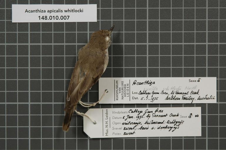 | Keywords: Naturalis Biodiversity Center - RMNH.AVES.75229 1 - Acanthiza apicalis whitlocki North, 1909 - Acanthizidae - bird skin specimen.jpeg artwork Dimensions artwork Document type Acanthizidae Acanthiza Individual count 1 Infraspecific epithet whitlocki Infraspecific rank Institution Naturalis Kind of unit artwork Kind of unit specimen skin Life stage Australiƫ Northern Territory Tennant Creek Cabbage Gum Bore Medium artwork Nomenclatural code Occurrence ID page Other fields Other versions artwork Permission license Naturalis donation CC-0 Publication location Scientific name Acanthiza apicalis whitlocki North 1909 Scientific name authorship North 1909 male Source url http //bioportal naturalis nl Specific epithet apicalis State or province Northern Territory Subject keywords artwork Subject keywords publication Title artwork Title publication Type status Uploaded with GWToolset Naturalis_Biodiversity_Center_-_RMNH AVES 75229_1_-_Acanthiza_apicalis_whitlocki_North _1909_-_Acanthizidae_-_bird_skin_specimen http //medialib naturalis nl/file/id/RMNH AVES 75229_1/format/large Media donated by Naturalis Biodiversity Center Songbird specimens at Naturalis Biodiversity Center Acanthiza apicalis museum specimens |
