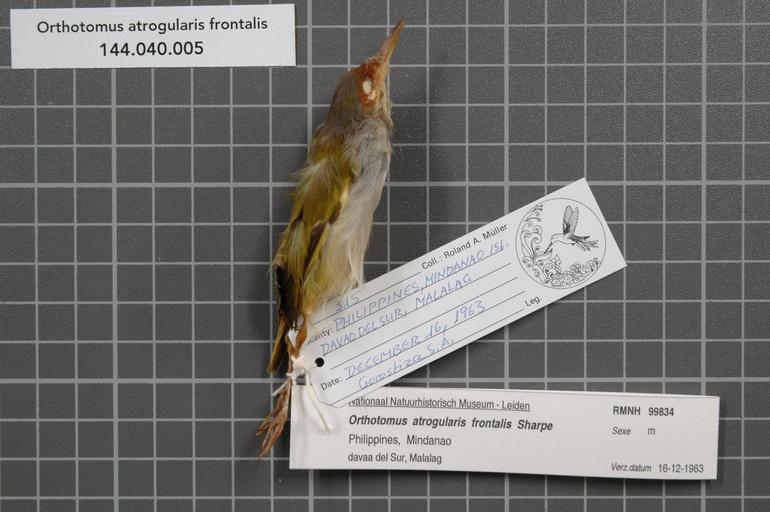 Keywords: Naturalis Biodiversity Center - RMNH.AVES.99834 1 - Orthotomus atrogularis frontalis Sharpe, 1877 - Sylviidae - bird skin specimen.jpeg artwork Dimensions artwork Document type Sylviidae Orthotomus Individual count 1 Infraspecific epithet frontalis Infraspecific rank Institution Naturalis Kind of unit artwork Kind of unit specimen skin Life stage Philippines Mindanao Isl Davao del Sur Malalag Medium artwork Nomenclatural code Occurrence ID page Other fields Other versions artwork Permission license Naturalis donation CC-0 Publication location Scientific name Orthotomus atrogularis frontalis Sharpe 1877 Scientific name authorship Sharpe 1877 male Source url http //bioportal naturalis nl Specific epithet atrogularis State or province Subject keywords artwork Subject keywords publication Title artwork Title publication Type status Uploaded with GWToolset Naturalis_Biodiversity_Center_-_RMNH AVES 99834_1_-_Orthotomus_atrogularis_frontalis_Sharpe _1877_-_Sylviidae_-_bird_skin_specimen http //medialib naturalis nl/file/id/RMNH AVES 99834_1/format/large Media donated by Naturalis Biodiversity Center Songbird specimens at Naturalis Biodiversity Center Orthotomus atrogularis |